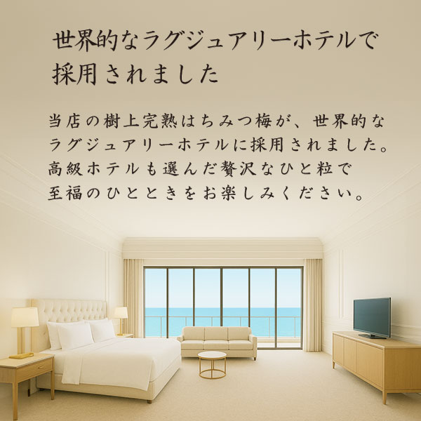 - 世界的に有名なラグジュアリーホテルがスイートルーム用の梅干しとして“せんのうめ”のはちみつ梅が採用されました。。