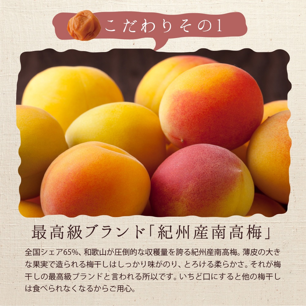 | 原材料 | <味梅>梅(和歌山県産)、漬け原材料(食塩、果糖ぶどう糖液糖、還元水飴、発酵調味料)/調味料(アミノ酸等)、酒精、酸味料、甘味料(ステビア)、V.B₁ <しそ梅>梅(和歌山県産)、しそ(国産)、漬け原材料(食塩、果糖ぶどう糖液糖、還元水飴、発酵調味料)/調味料(アミノ酸等)、酒精、酸味料、甘味料(ステビア)、V.B₁、野菜色素 |