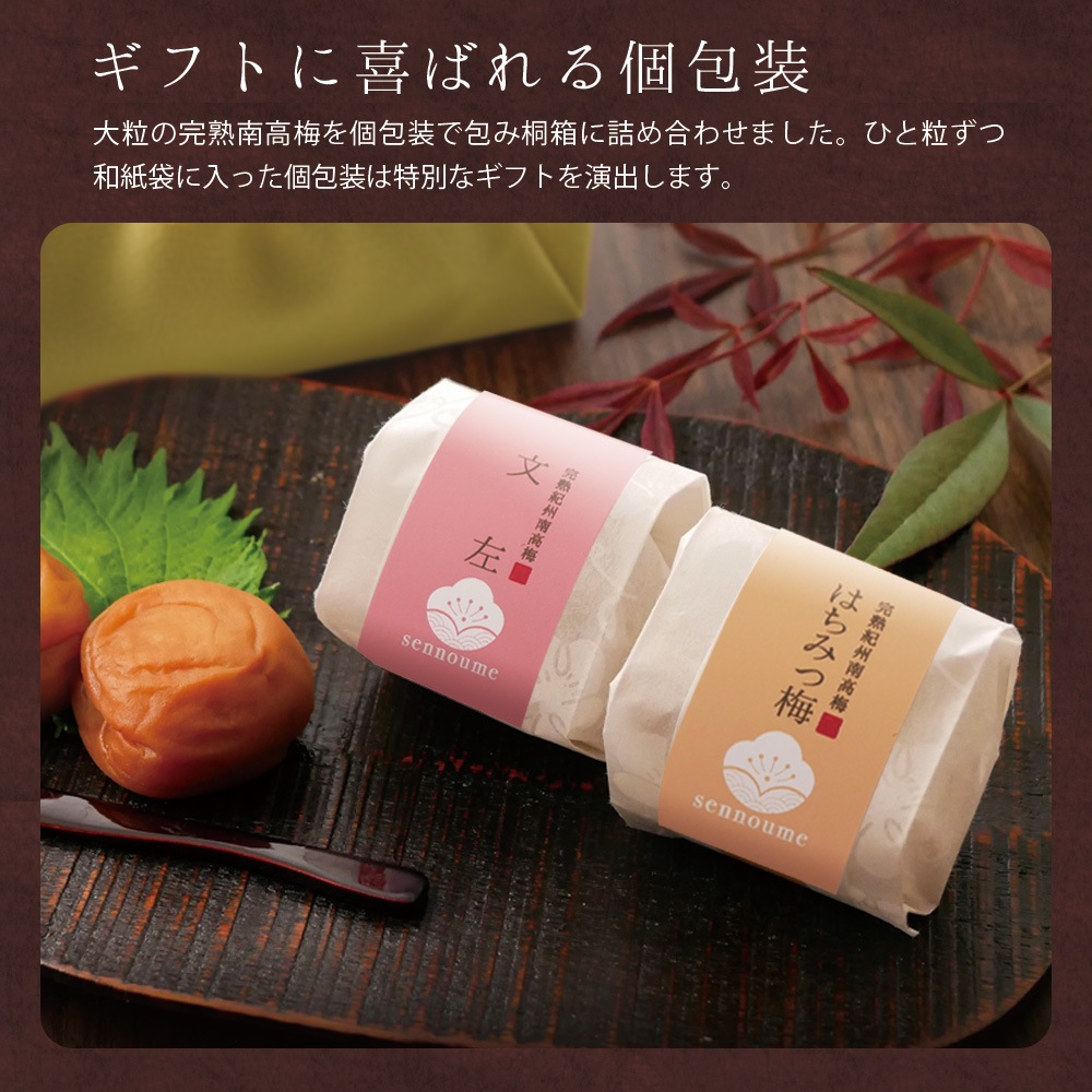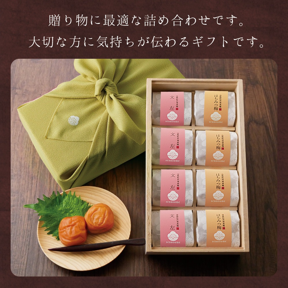 | 原材料 | <文左>梅(和歌山県産)、漬け原材料(食塩、果糖ぶどう糖液糖、還元水飴、発酵調味料)/調味料(アミノ酸等)、酒精、酸味料、甘味料(ステビア)、V.B₁ <はちみつ梅>梅(和歌山県産)、漬け原材料(食塩、果糖ぶどう糖液糖、還元水飴、醸造酢、蜂蜜、鰹エキス)/酒精、調味料(アミノ酸等)、酸味料、甘味料(ステビア)、V.B₁、ユッカ抽出物 |